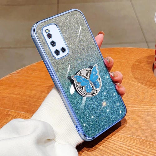 Para Vivo V19 Funda para Teléfono de TPU con Soporte de Mariposa con Brillo Degradado Plateado India (Azul Sierra)