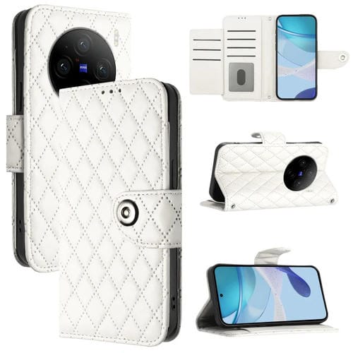 Para Vivo X100 Funda para Teléfono de Cuero con Tapa con Textura Rómbica y Cordón (Blanco)