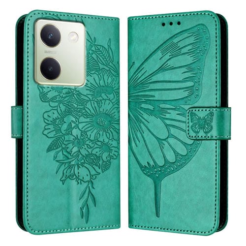 Para Vivo Y100 5G Funda para Teléfono de Cuero con Mariposa En Relieve Global (Verde)