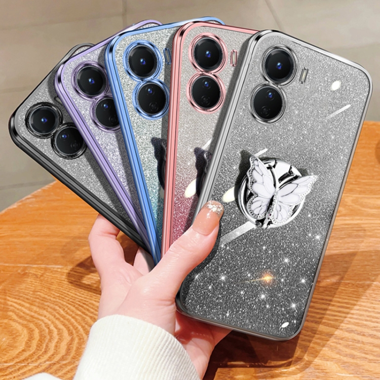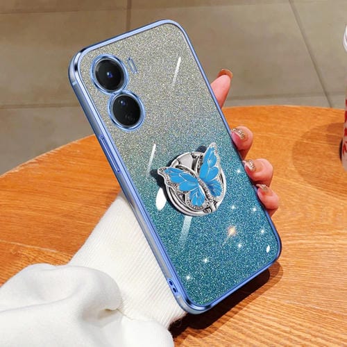 Para Vivo Y16 Funda para Teléfono de TPU con Soporte de Mariposa con Brillo Degradado Plateado (Azul Sierra)