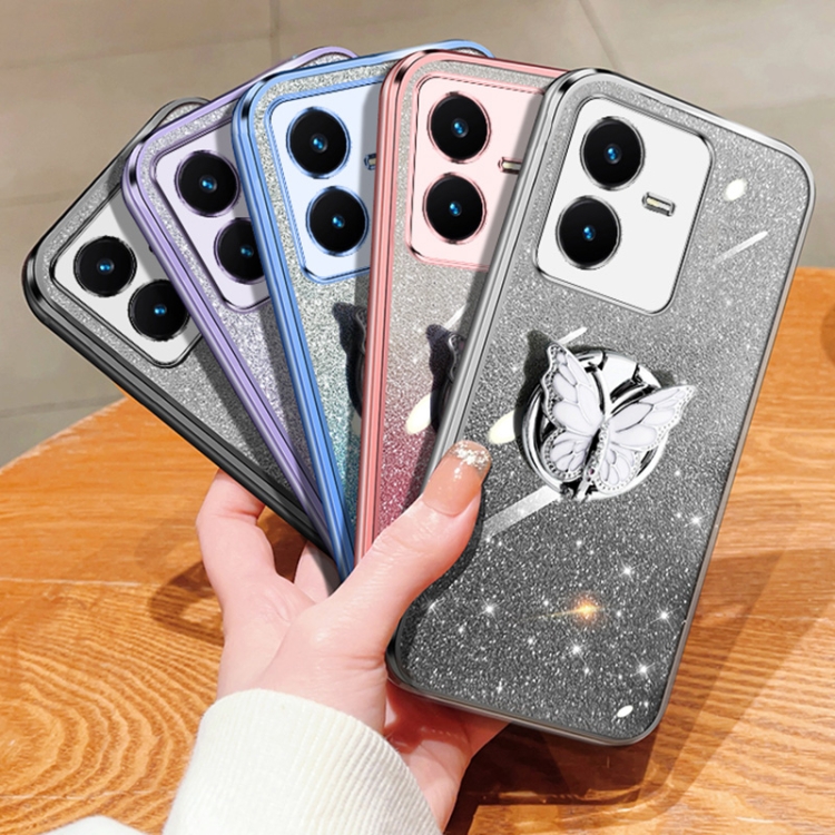 Para Vivo Y22 / Y22S Funda para Teléfono de TPU con Soporte de Mariposa con Brillo Degradado Plateado (Negro)