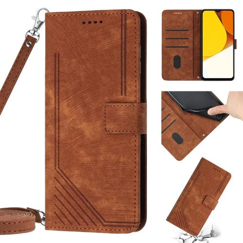 Para Vivo Y35 4G 2022 / Y22S / Y22 Skin Feel Stripe Pattern Funda de Cuero para Teléfono con Cordón (Marrón)