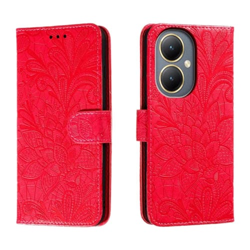 Para Vivo Y35M + Funda para Teléfono de Cuero con Tapa y Estampado de Flores de Encaje (Rojo)