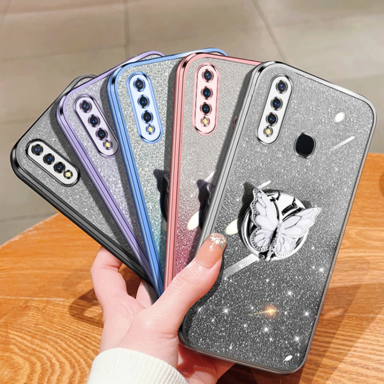 Para Vivo Y5S Estuche para Teléfono de TPU con Soporte de Mariposa con Brillo Degradado Plateado (Negro)