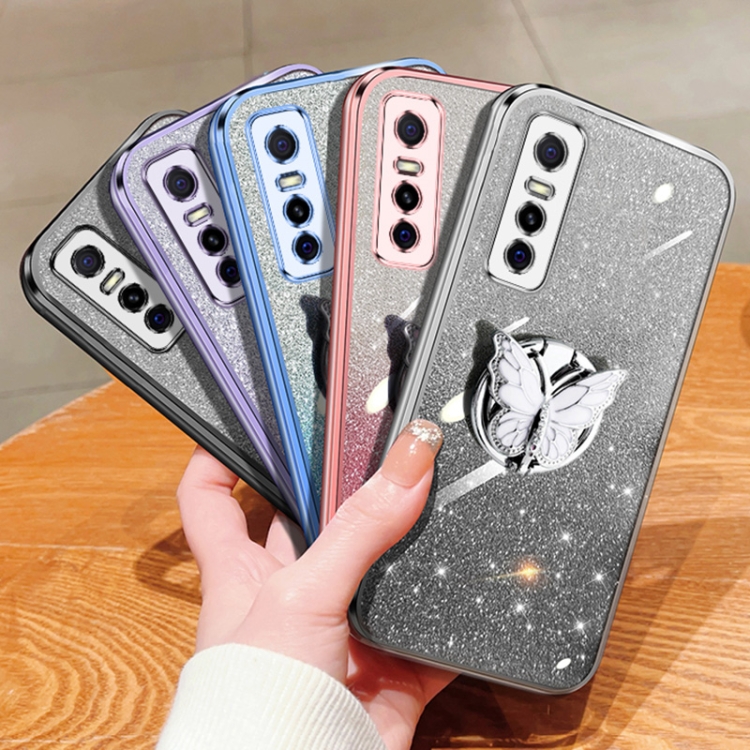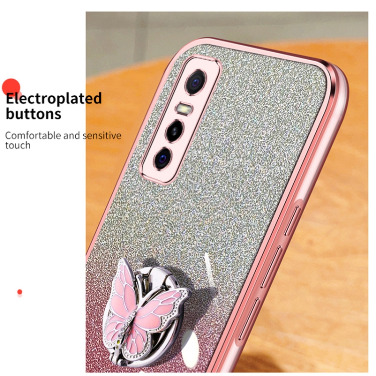 Para Vivo Y73S Estuche para Teléfono de TPU con Soporte de Mariposa con Brillo Degradado Plateado (Púrpura)