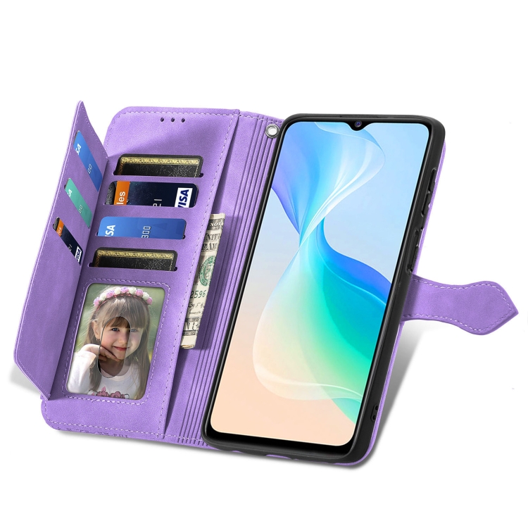 Para Vivo Y76 5G Estuche para Teléfono de Cuero con Cremallera y Flor En Relieve (Púrpura)