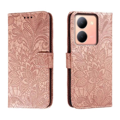 Para Vivo Y78 Funda para Teléfono de Cuero con Tapa y Estampado de Flores de Encaje (Oro Rosa)
