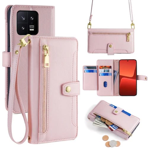 Para Xiaomi 13 Funda de Cuero para Teléfono con Billetera con Cremallera y Cuerpo Cruzado con Textura de Oveja (Rosa)