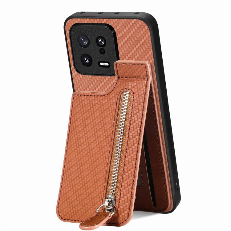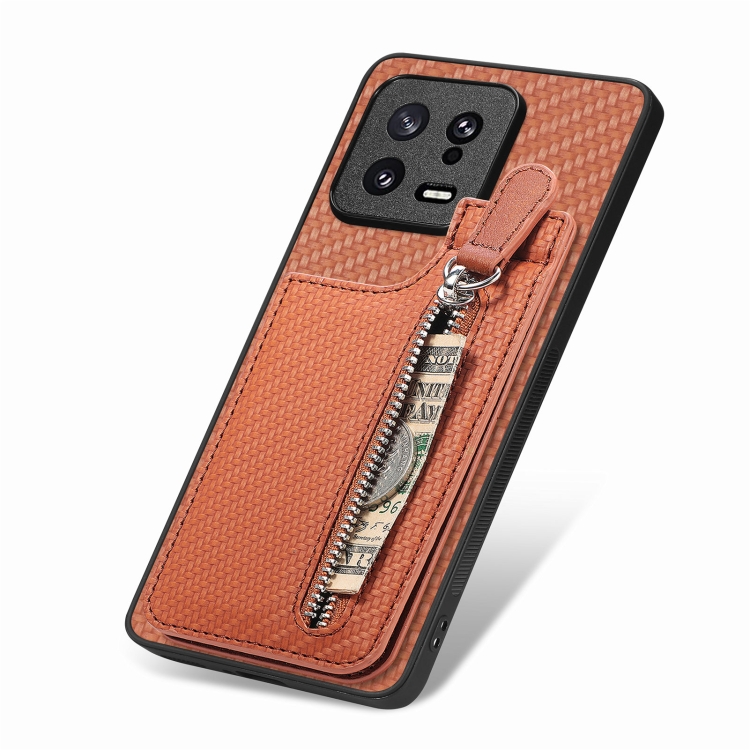 Para Xiaomi 13 Funda de Teléfono con Cremallera Vertical de Fibra de Carbono (Marrón)