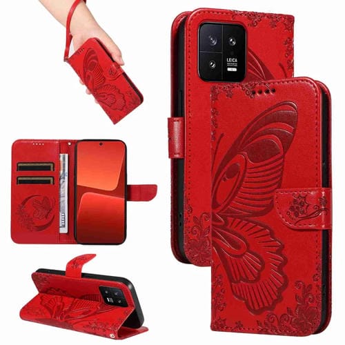 Para Xiaomi 13 Swallowtail Butterfly Funda de Cuero para Teléfono En Relieve (Rojo)