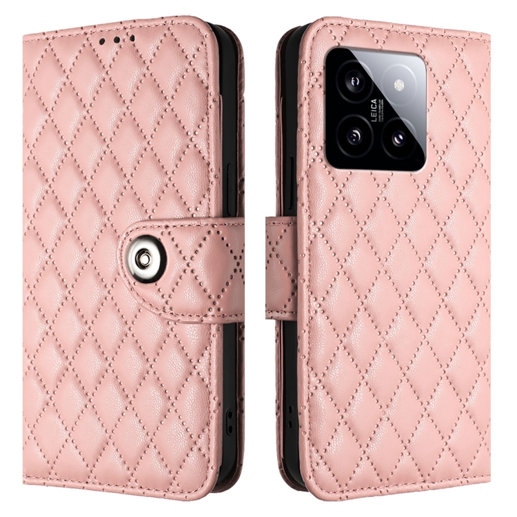 Para Xiaomi 14 Funda De Teléfono De Cuero Con Tapa Con Textura Rómbica Y Cordón (Rosa Coral)