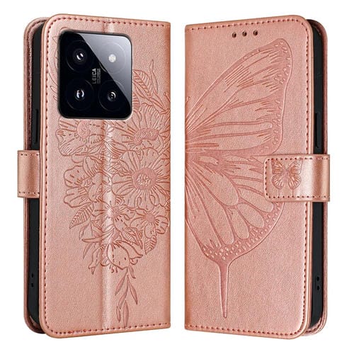 Para Xiaomi 14 Pro 5G Funda Para Teléfono De Cuero Con Mariposa En Relieve Global (Oro Rosa)
