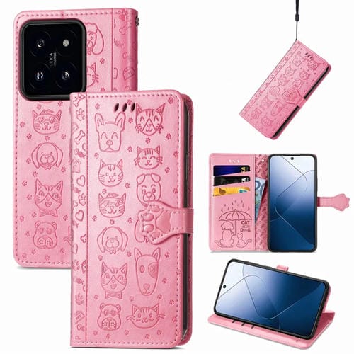 Para Xiaomi 14 Pro Funda De Teléfono De Cuero Con Relieve De Perro Y Gato (Rosa)
