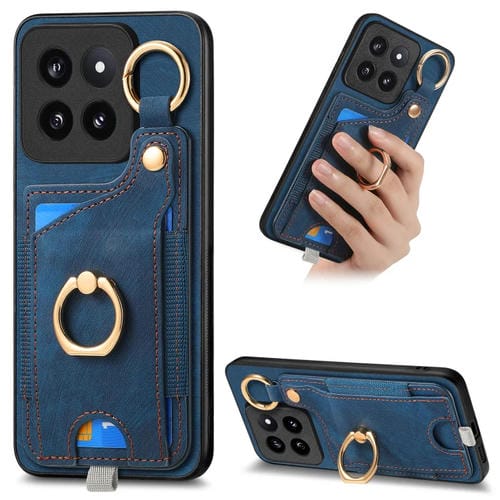 Para Xiaomi 14 Pro Funda Para Teléfono Con Bolsa Para Tarjeta Con Anillo Y Sensación De Piel Retro Con Lazo Para Colgar (Azul)