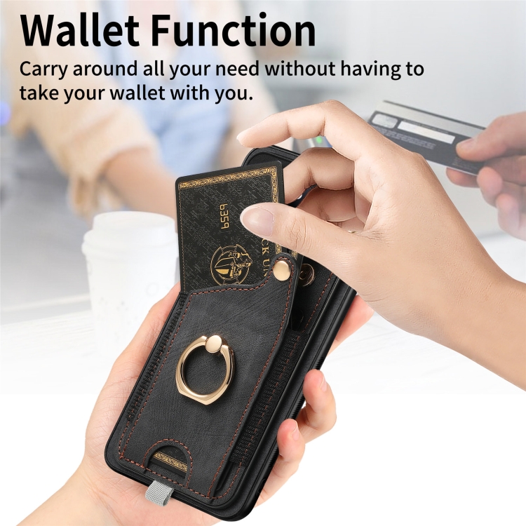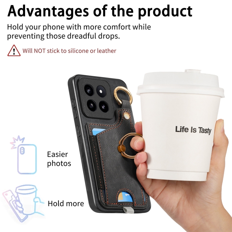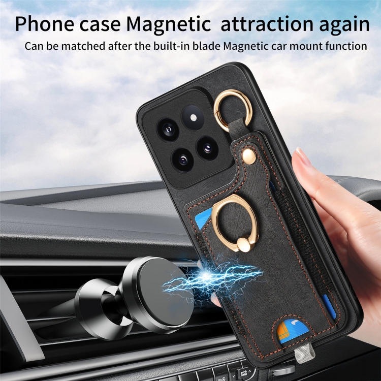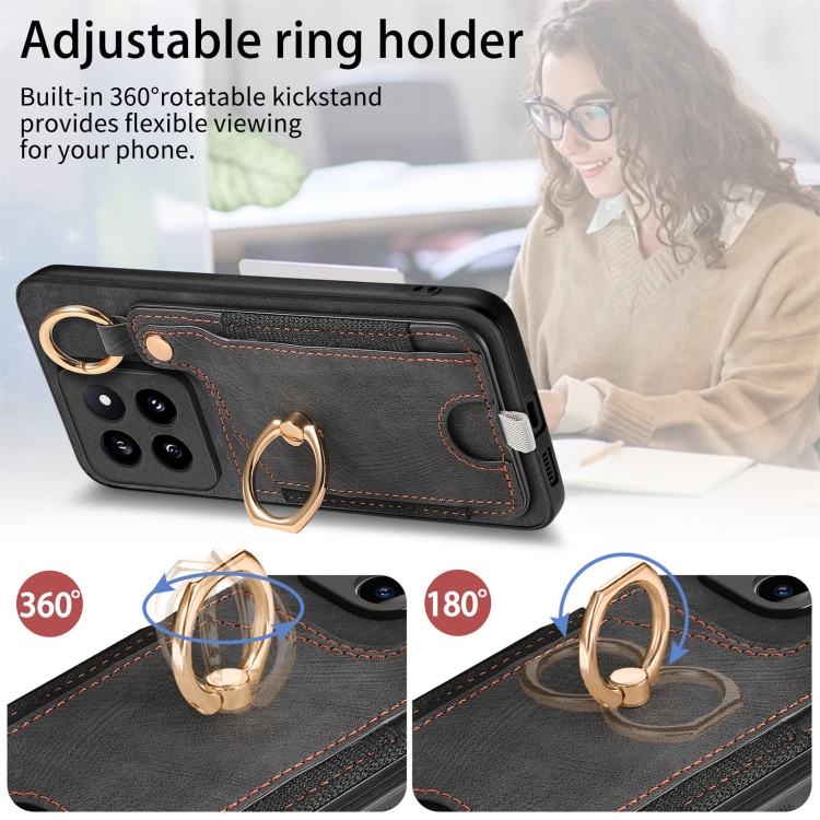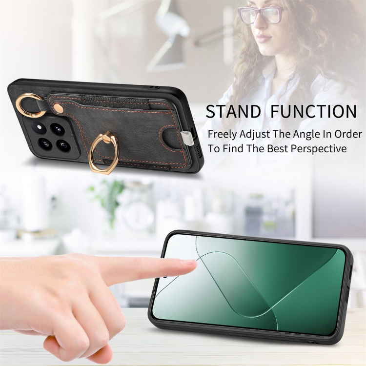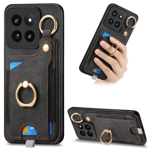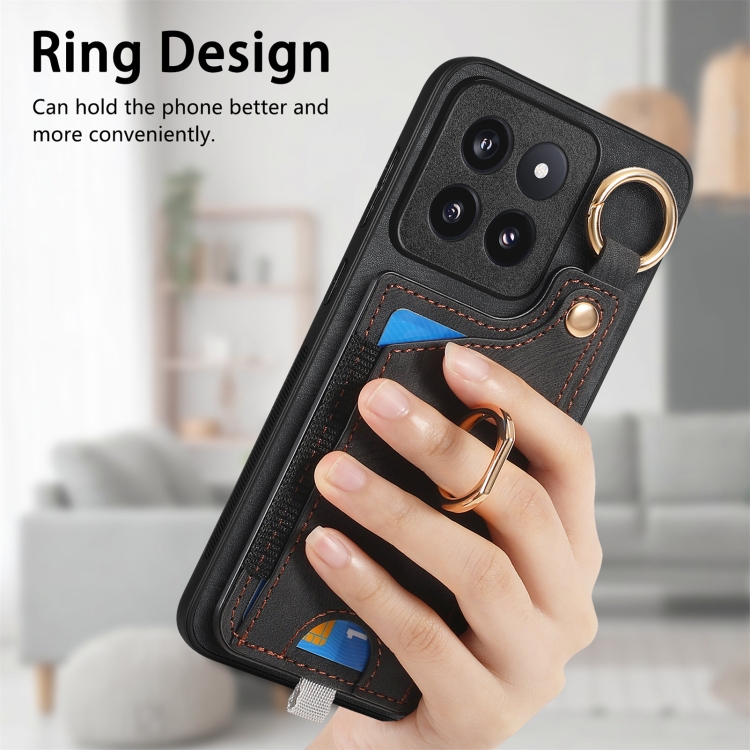 Para Xiaomi 14 Pro Funda Para Teléfono Con Bolsa Para Tarjeta Con Anillo Y Sensación De Piel Retro Con Lazo Para Colgar (Negro)