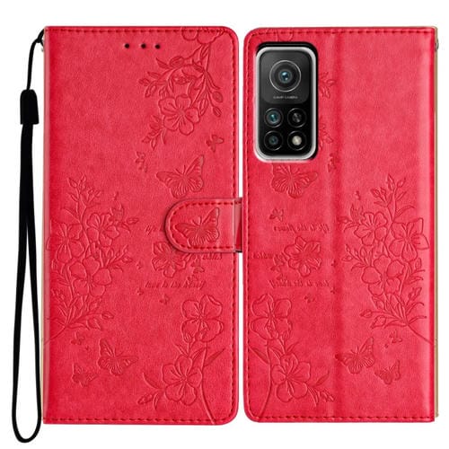 Para Xiaomi Mi 10T 5G Funda de Cuero para Teléfono con Mariposas y Flores (Rojo)