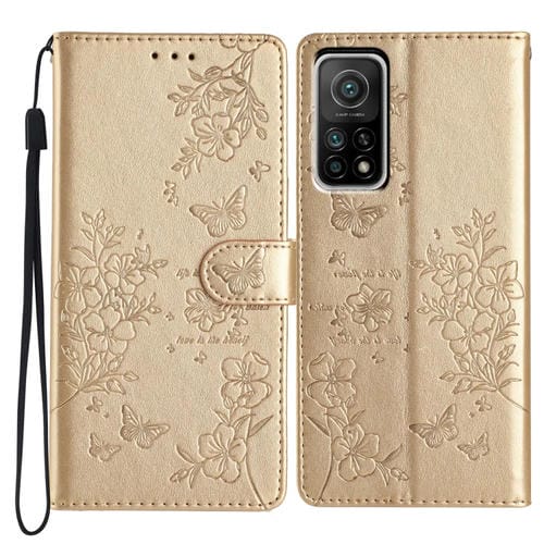 Para Xiaomi Mi 10T Pro 5G Funda de Cuero para Teléfono con Mariposas y Flores (Dorado)