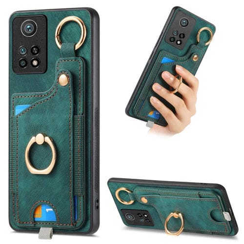 Para Xiaomi Mi 10T Pro Funda para Teléfono con Bolsa para Tarjeta con Anillo y Sensación de Piel Retro con Lazo para Colgar (Verde)
