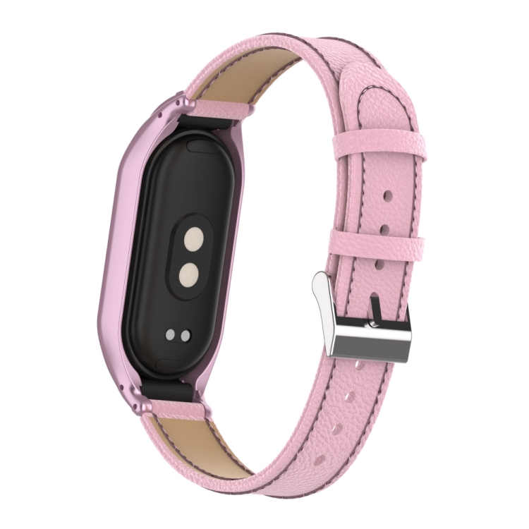 Estuche de Metal + Correa de Cuero Textura Litchi para Xiaomi Mi Band 8 (Rosa)
