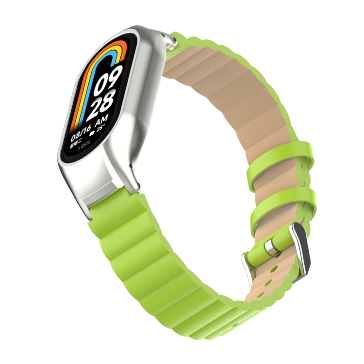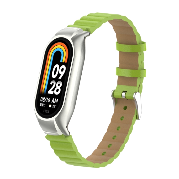 Estuche de Metal + Correa de Cuero de Bambú para Xiaomi Mi Band 8 (Verde Hierba)