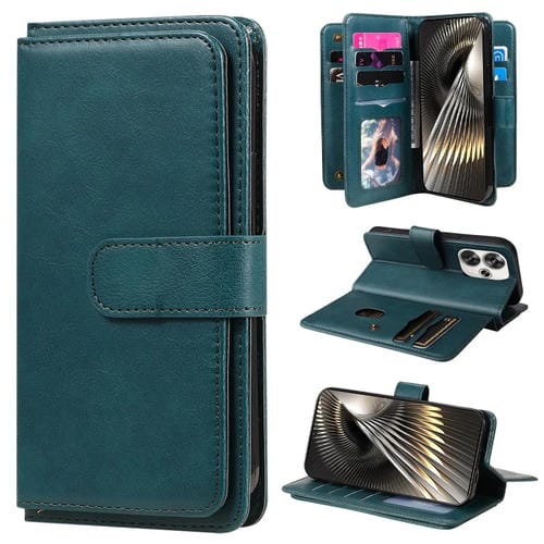 Para Xiaomi Poco F6 Cartera Multifunción 10 Ranuras para Tarjetas Funda de Cuero para Teléfono (Verde Oscuro)