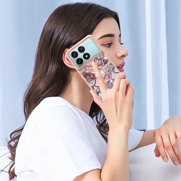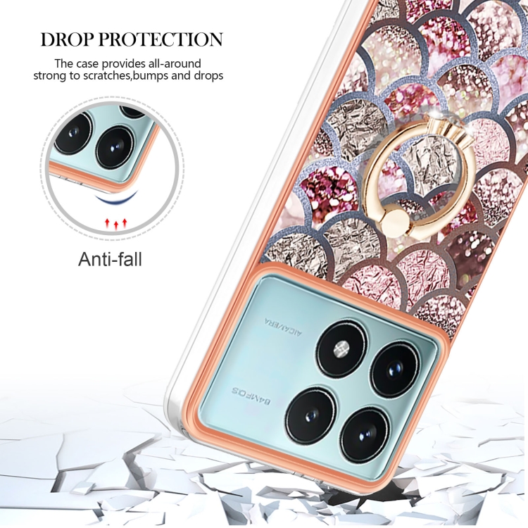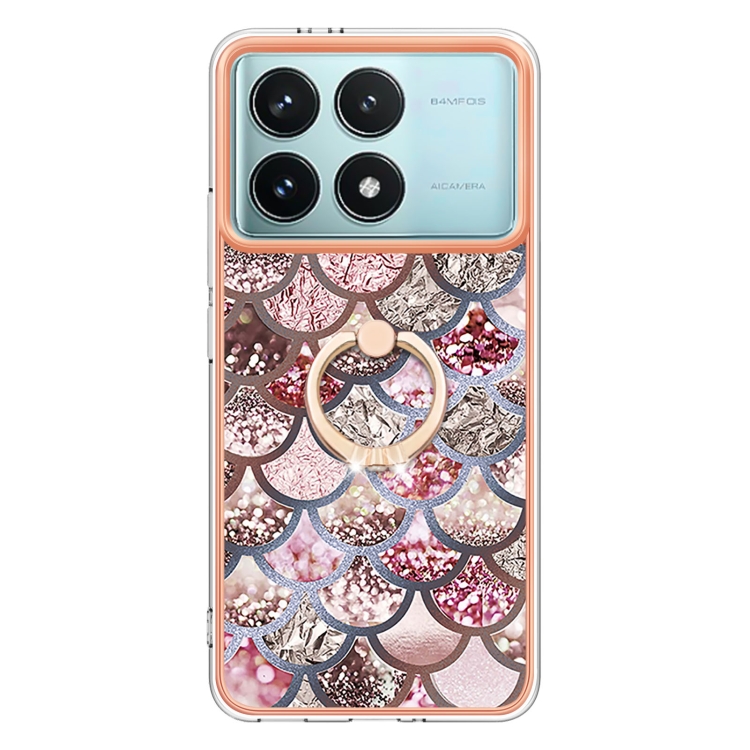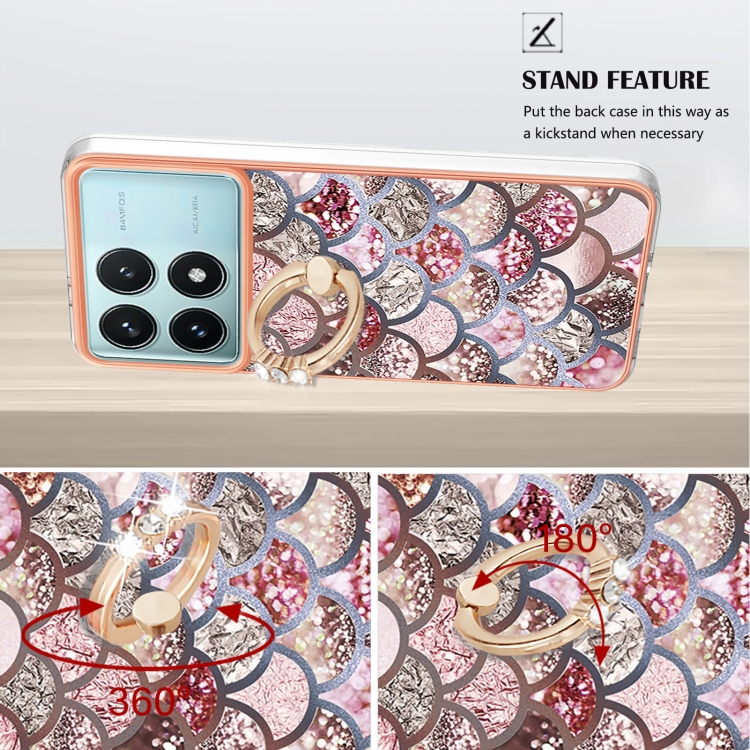 Para Xiaomi Poco F6 Pro 5G Estuche a Prueba de Golpes con Patrón de Galvanoplastia Imd TPU con Soporte de Anillo de Diamantes de Imitación (Escamas Rosas)