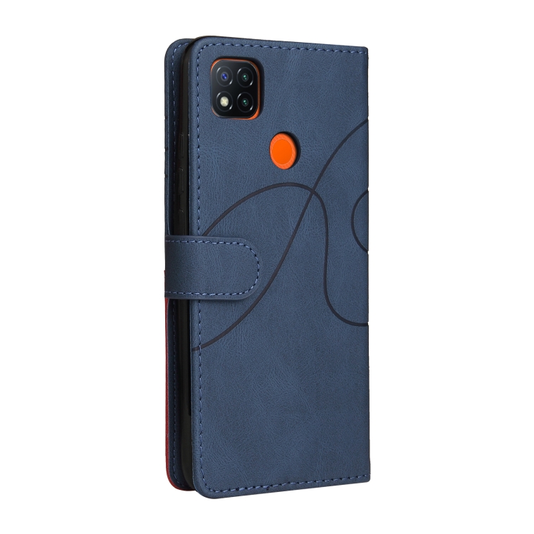 Para Xiaomi Redmi 9C Empalme de Doble Color Funda de Cuero Horizontal Flip Pu con Soporte y Tragamonedas y Billetera (Azul)