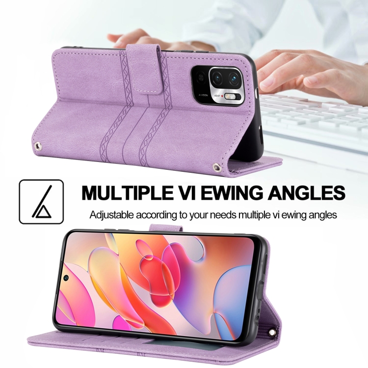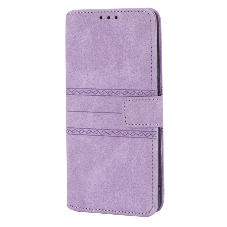 Para Xiaomi Redmi Note 10 Hebilla Magnética a Rayas En Relieve Pu + TPU Funda de Cuero Horizontal Flip de TPU con Soporte y Ranura para Tarjeta y Billetera y Marco de Fotos y Sling (Púrpura)