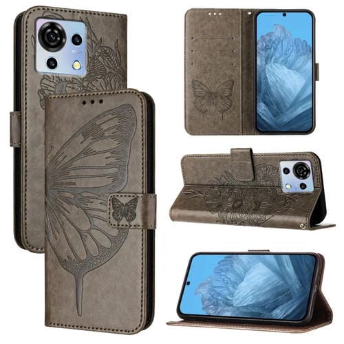 Funda de Cuero para ZTE Blade V50 Vita con Mariposa en Relieve (Gris)
