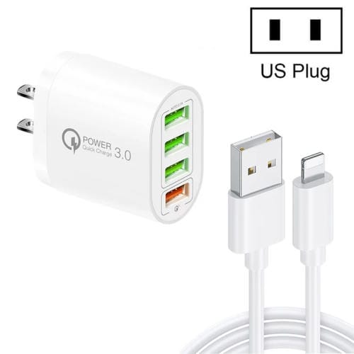 Cargador de Puertos Múltiples Qc-04 Qc3.0 + 3x Usb2.0 con Cable 3A Usb a 8 Pin (Blanco)