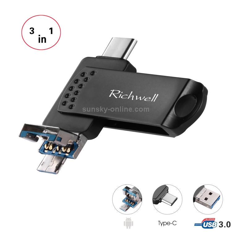 Disco Flash Richwell 3 En 1 16G Tipo-C Micro USB USB 3.0 Metal Función Otg (Negro)