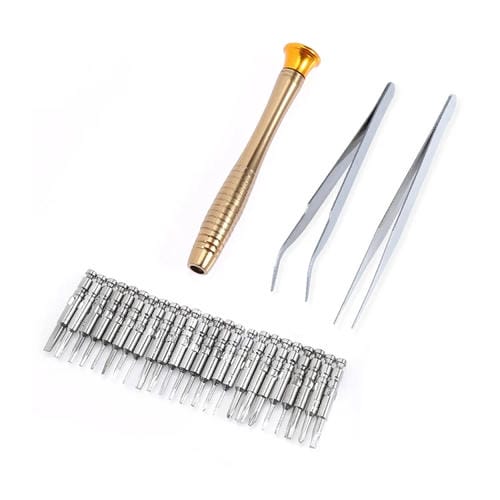 - Incluye 1 mango magnético, 24 cabezales con especificaciones T2, T3, T4, T5, T6, T7, T8, T9, T10, T15, Phillips 1.0, 1.2, 1.5, 2.0, 3.0, ranuradas 1.0, 1.5, 2.0, 3.0, estrellas 0.8 y 1.2, triángulo 2.3 y dedal 0.8; fuerte magnetismo para inserción rápida de puntas