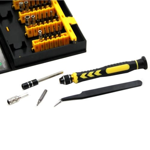 El Juego de Destornilladores Profesional JF-6097A 38 en 1 es un Conjunto completo de herramientas diseñado para la reparación precisa y eficiente de dispositivos Móviles, especialmente compatible con modelos de iPhone 6, iPhone 5 y 5S. Este kit incluye una variedad de puntas intercambiables que cubren múltiples tipos de tornillos, permitiendo a los usuarios que reparan por cuenta propia abordar tareas complejas en Teléfonos inteligentes y otros dispositivos electrónicos como televisores, PDA y PC. Fabricado con materiales de alta calidad y precisión, el Juego ofrece un diseño compacto y fácil de transportar, facilitando su uso tanto en talleres profesionales como en entornos domésticos.