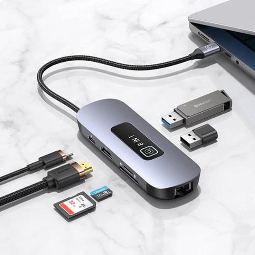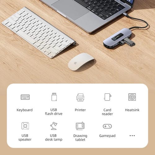 El Hub Tipo C Usams Us-SJ643 (Gris Metal) es un concentrador multifuncional diseñado para ampliar las capacidades de Conexión de dispositivos con Puerto USB Tipo C. Compatible con una amplia variedad de laptops y Teléfonos que soportan USB-C, este hub integra ocho interfaces que permiten conectar simultáneamente periféricos como Mouse, Teclado, unidades flash USB, impresoras, Tarjetas de memoria y monitores externos. Su función principal es facilitar la transferencia de datos, la Carga rápida y la Conexión a redes Cableadas y Pantallas de alta resolución, todo en un diseño compacto y Portátil fabricado en aleación de aluminio para una óptima disipación térmica y durabilidad.