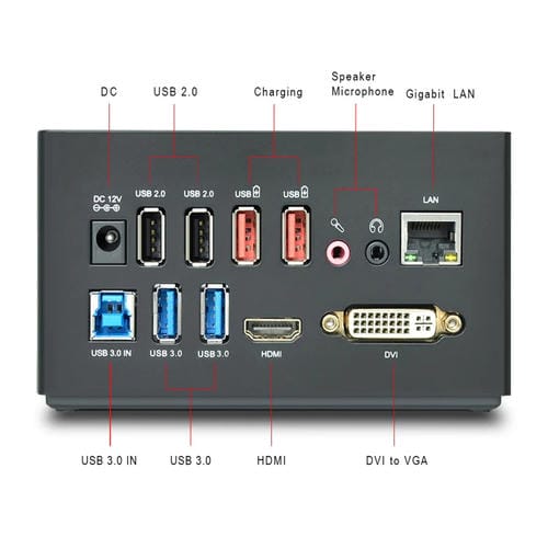 - Interfaces: HDMI, DVI, VGA, USB 3.0/2.0, Puerto Gigabit Ethernet, Puerto de Carga CC; Chipsets DL-3900, VL813, EJ179V; Potencia: 12 V/4 A; Soporta hasta 3 Pantallas externas; Resolución de vídeo hasta 2048 × 1152; Requiere procesador Core i3 o superior y 4GB de memoria para rendimiento óptimo