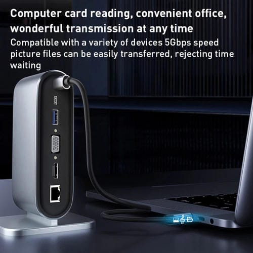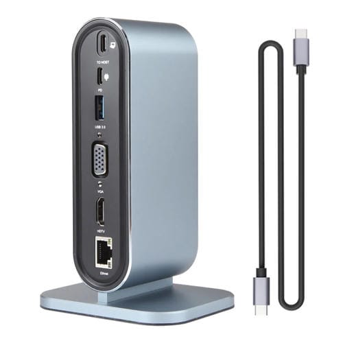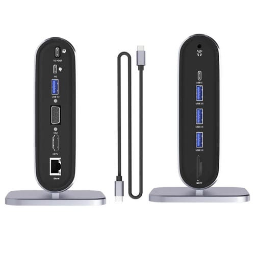• Interfaces: USB Tipo-C, 4 Puertos USB 3.0, Carga PD 100W, VGA 1080P, salida 4K, LAN, Lector de Tarjetas SD y TF, Conector de audio de 3,5 mm