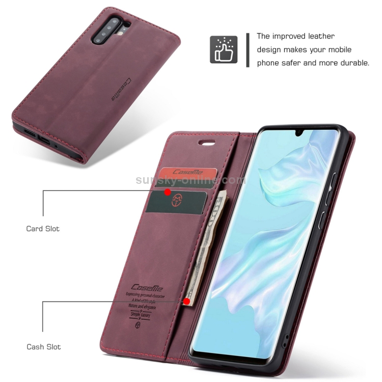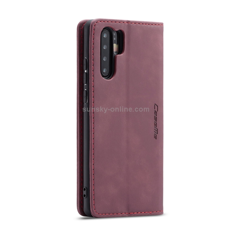 Estuche multifuncional Caseme-013 de cuero abatible horizontal para Huawei P30 Pro con ranura, soporte y billetera (Rojo Vino)