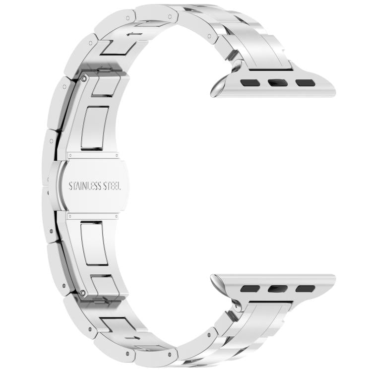 Correa de aleación de titanio con hebilla de mariposa de tres cuentas y ajuste delgado para Apple Watch de 42 mm / 41 mm / 40 mm / 38 mm (con separadores plateados).