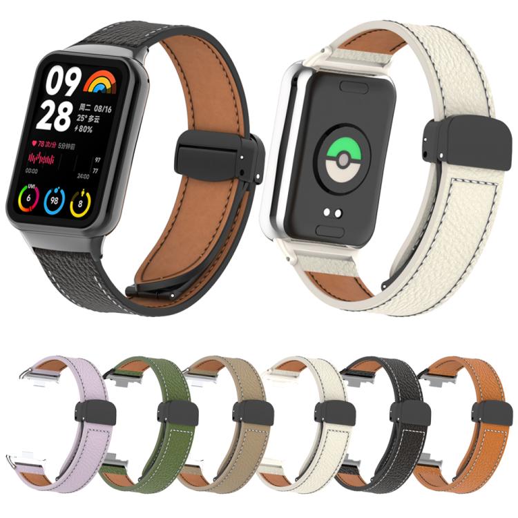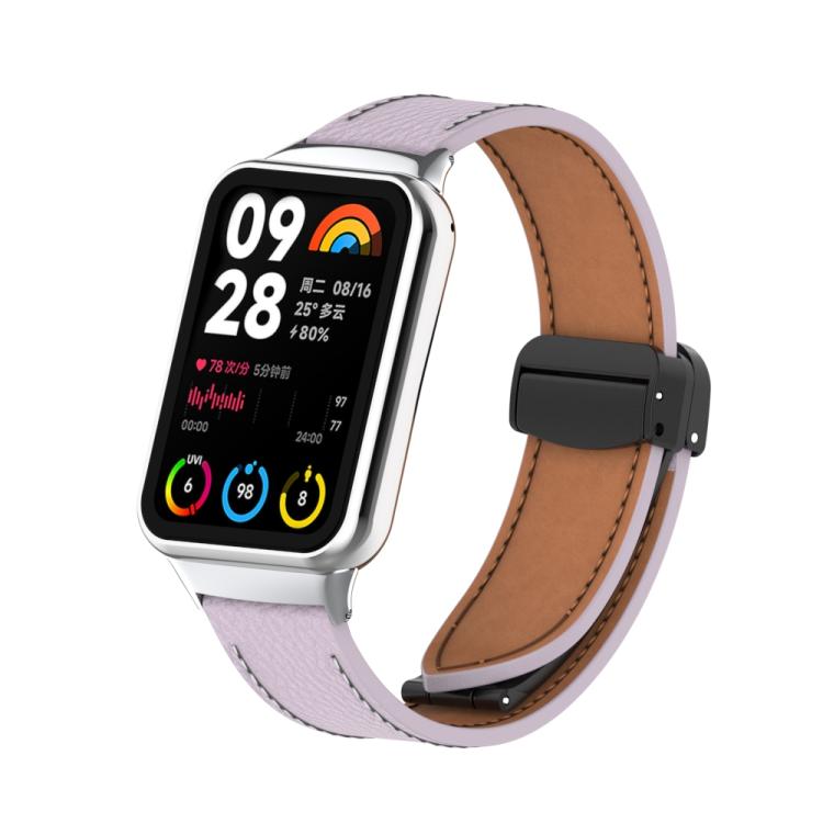 Correa de cuero con hebilla magnética negra y textura de lichi para Xiaomi Smart Band 9 Pro y Redmi Watch 5 (morado)