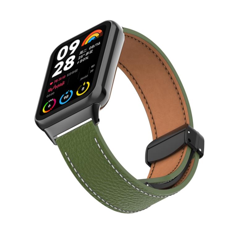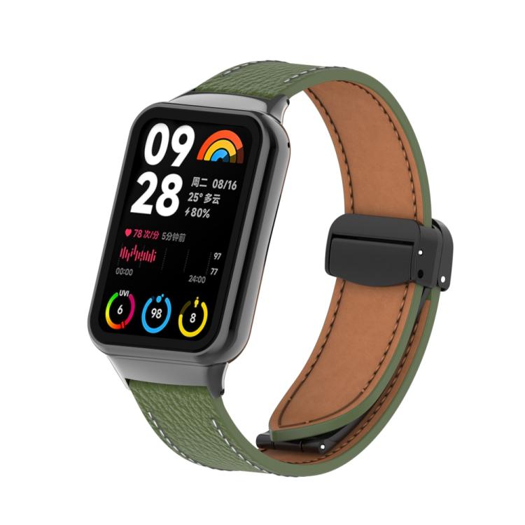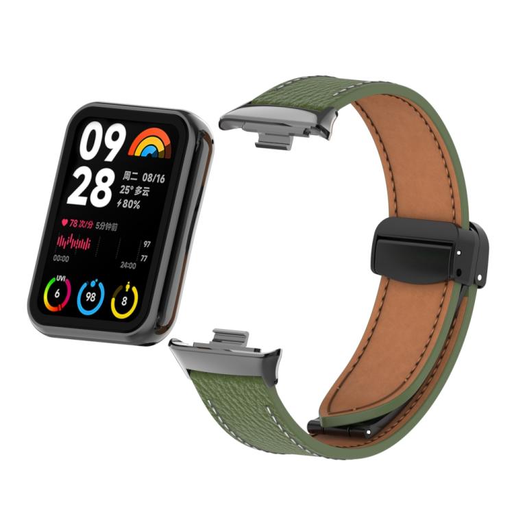 Correa de cuero con hebilla magnética negra y textura de lichi para Xiaomi Smart Band 9 Pro y Redmi Watch 5 (verde militar)