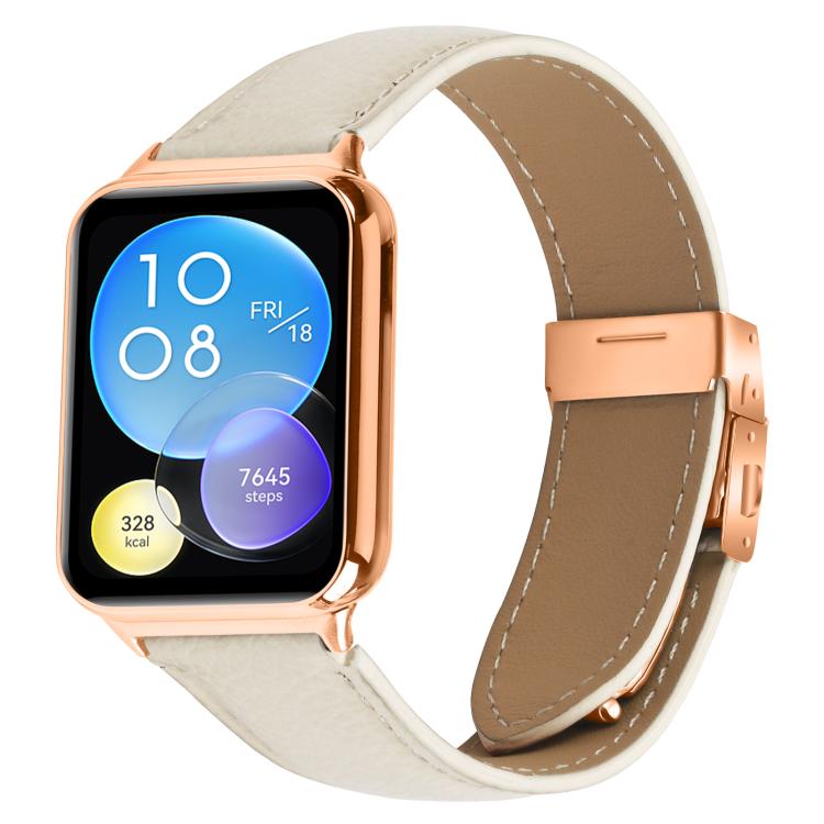 Correa de cuero con hebilla trasera de tortuga en oro rosa con textura de lichi para Xiaomi Smart Band 9 Pro y Redmi Watch 5 (blanco cremoso)