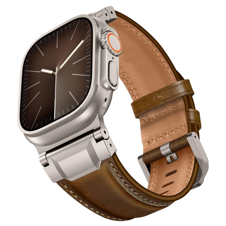 Correa de cuero estilo armadura para Apple Watch de 46 mm, 49 mm, 45 mm y 44 mm (nueva hebilla de titanio Crazy Horse marrón oscuro)