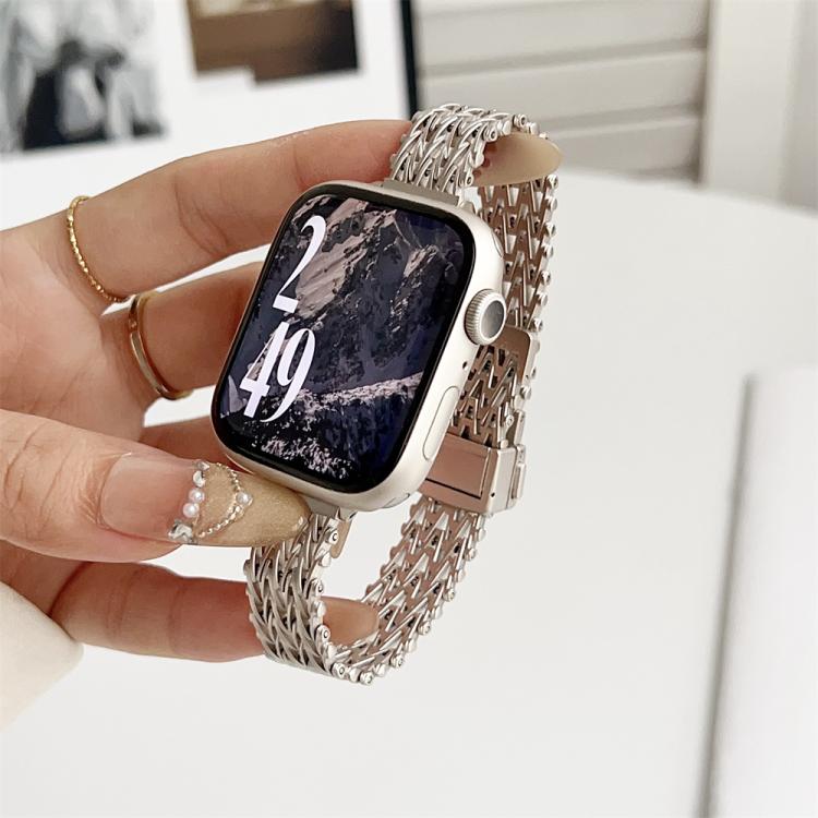 Correa de reloj de malla metálica de acero delgada con cierre magnético para Apple Watch de 46 mm / 49 mm / 45 mm / 44 mm (Starlight)