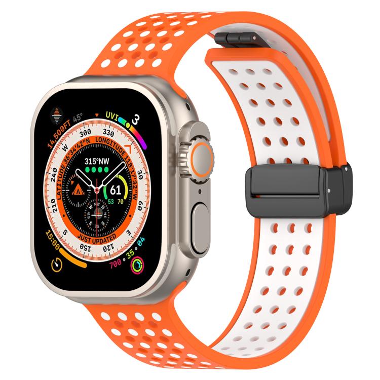 Correa de silicona transpirable con hebilla magnética para Apple Watch de 46 mm, 49 mm, 45 mm y 44 mm (naranja y blanco)