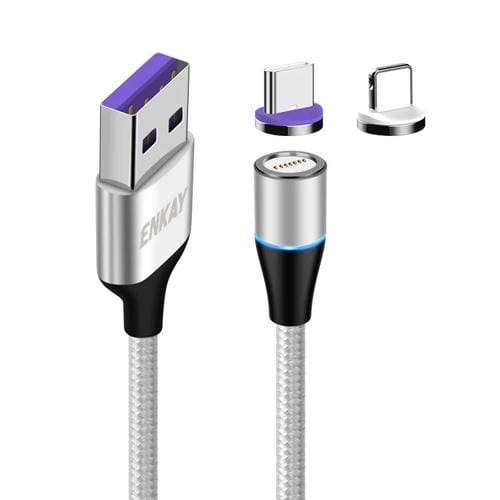 Cable 2 en 1 Enkay 5A USB A Tipo-C Carga Rápida Magnético 8 Pines Luz Led (Plata)