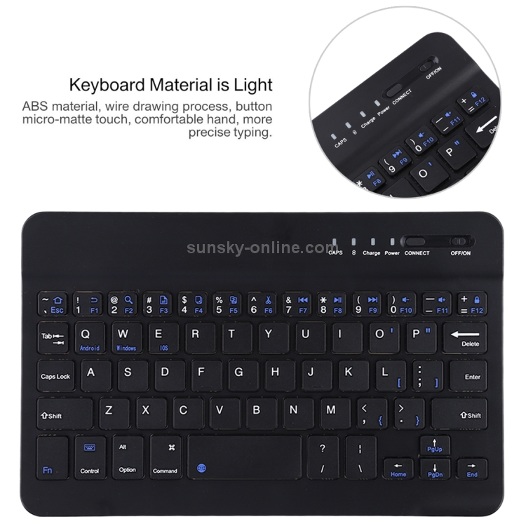 - Teclado magnético desmontable con Batería de polímero de litio 200mAh, Bluetooth 3.0, tiempo de trabajo continuo de 100 horas, tiempo de espera superior a 100 días, Carga micro USB 5V, alcance de Conexión de 10 metros, vida útil de 5 millones de pulsaciones