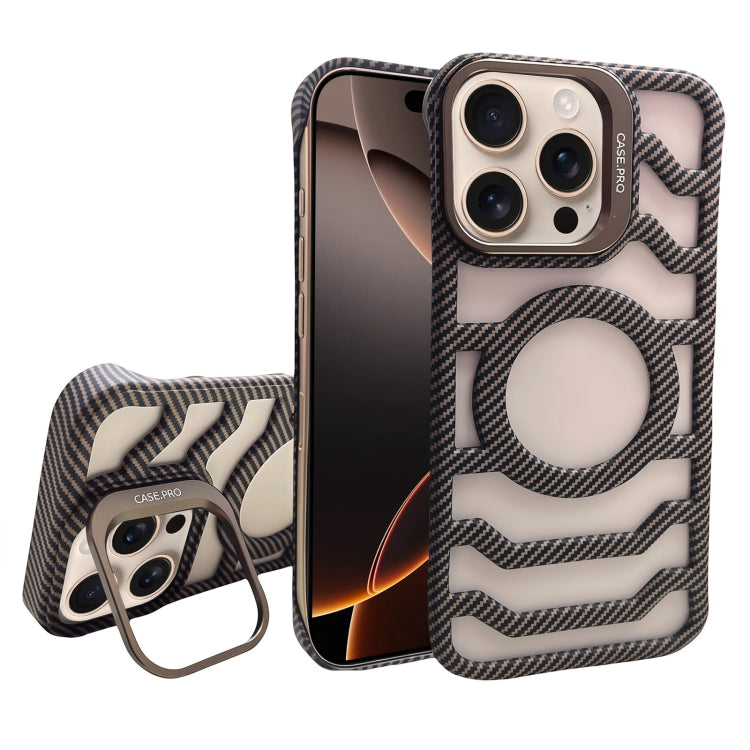 Estuche para Teléfono Magsafe con Soporte y Protección de Lente Fibra de Carbono para iPhone 16 Pro (Dorado)