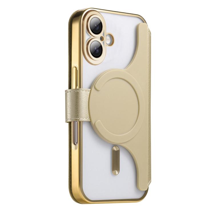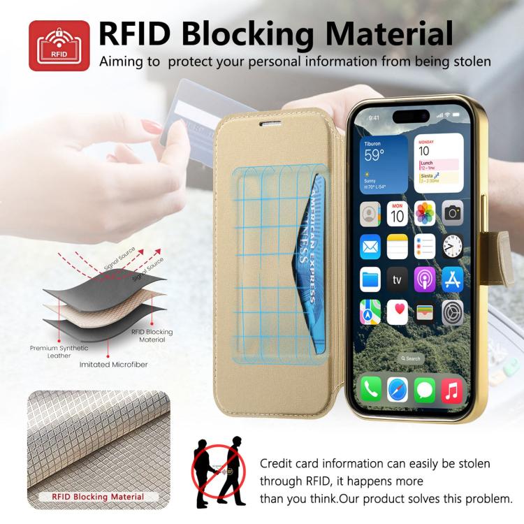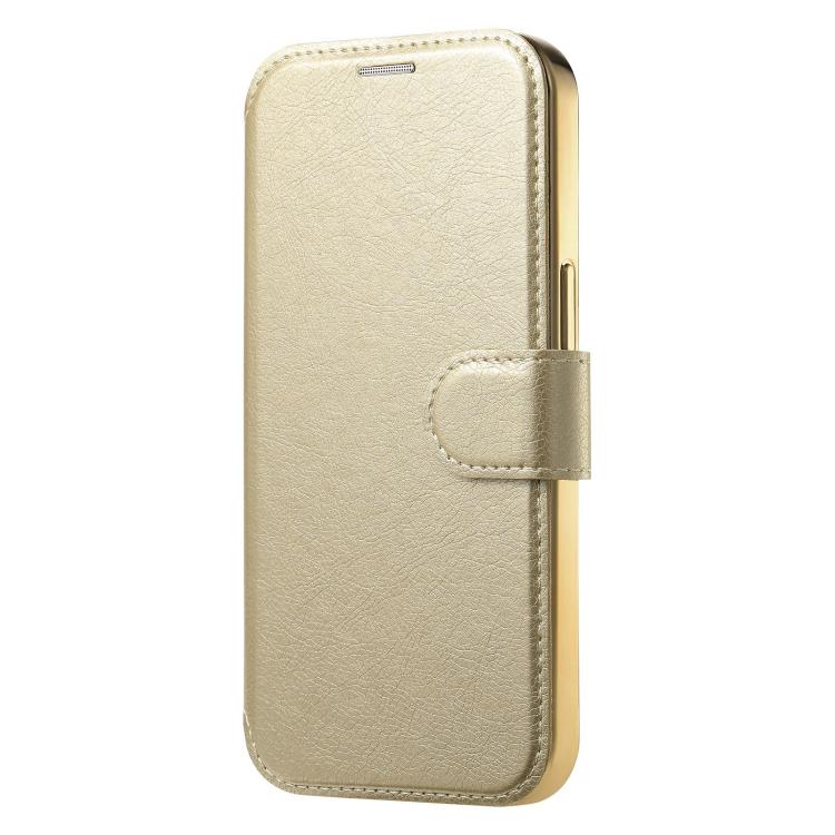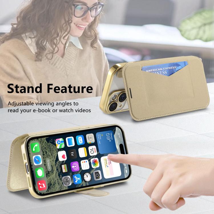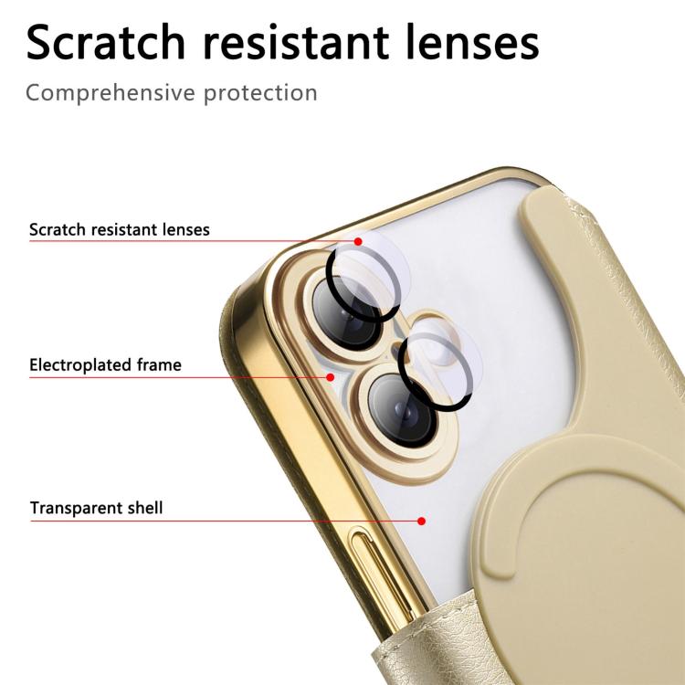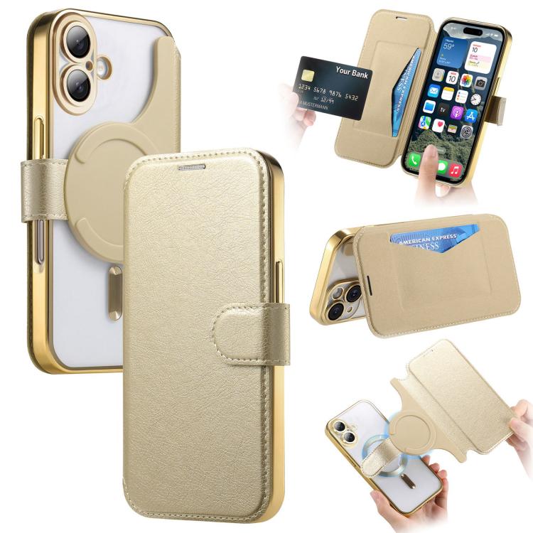 Funda de cuero antirrobo MagSafe RFID galvanizada divisible para iPhone 17 con protector de lente (dorado)