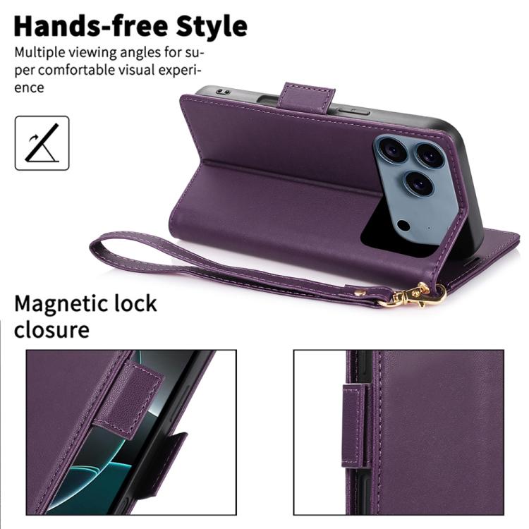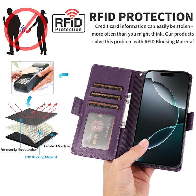 Funda de cuero antirrobo RFID con hebilla lateral para iPhone 17 Pro (morado oscuro)
