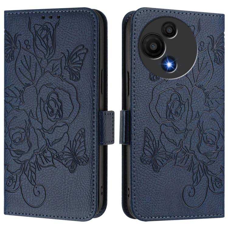 Funda de cuero antirrobo RFID con relieve rosa para TCL 605/60 SE (azul oscuro)